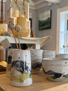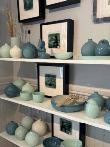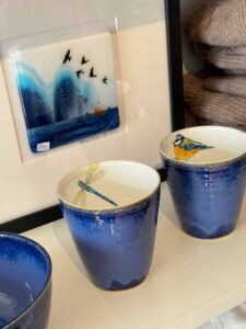 Håndlaget glasskunst, keramikk, porselen og akvarell av Heidi Mitsel Bullen.
